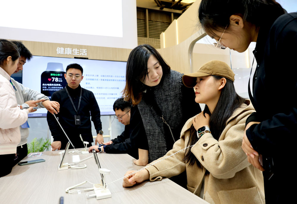 国度统计局旧事讲话人、国平易近经济分析统计司司长付凌晖暗示,一位参不雅者(左二)正在体验智妙手表的腕部动态血压记实仪功能。将5G+AI场景算法融合,记者 方喆 摄